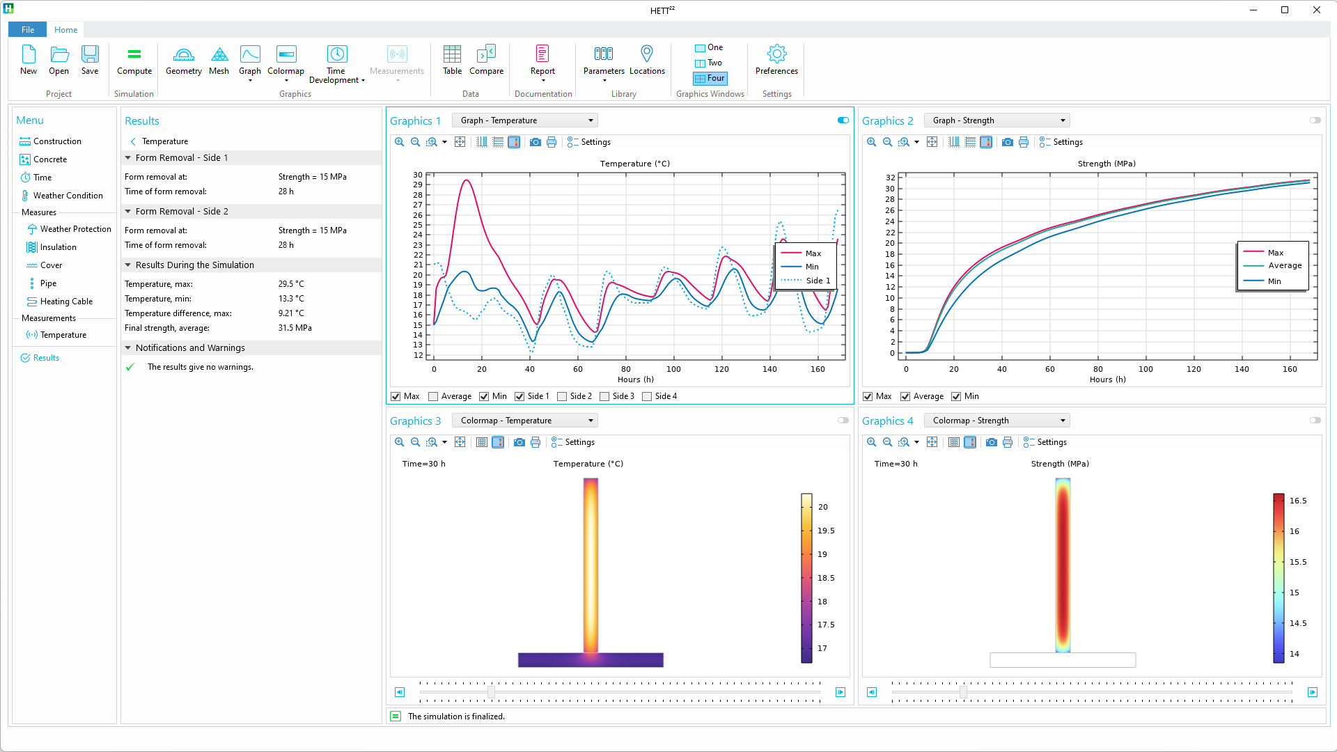With help from the COMSOL models powering the app, HETT22 yields predictive values for determining how long it will take to achieve the desired strength — in this example, 15 MPa — before form removal. "We can track expected temperatures for the surrounding air and soil and forecast a temperature curve for the concrete itself," said Fredvik. (Figure 5) "Based on our temperature development, we can calculate that it will take about 30 hours for the entire casting to reach the strength that we need." If that is too long for this particular job, then HETT22 can show the potential effect of different concrete selections on the estimated time for form removal. Builders can select different options from a menu of Heidelberg Materials' concrete products as well as review details about the performance characteristics of each option directly in the simulation app.