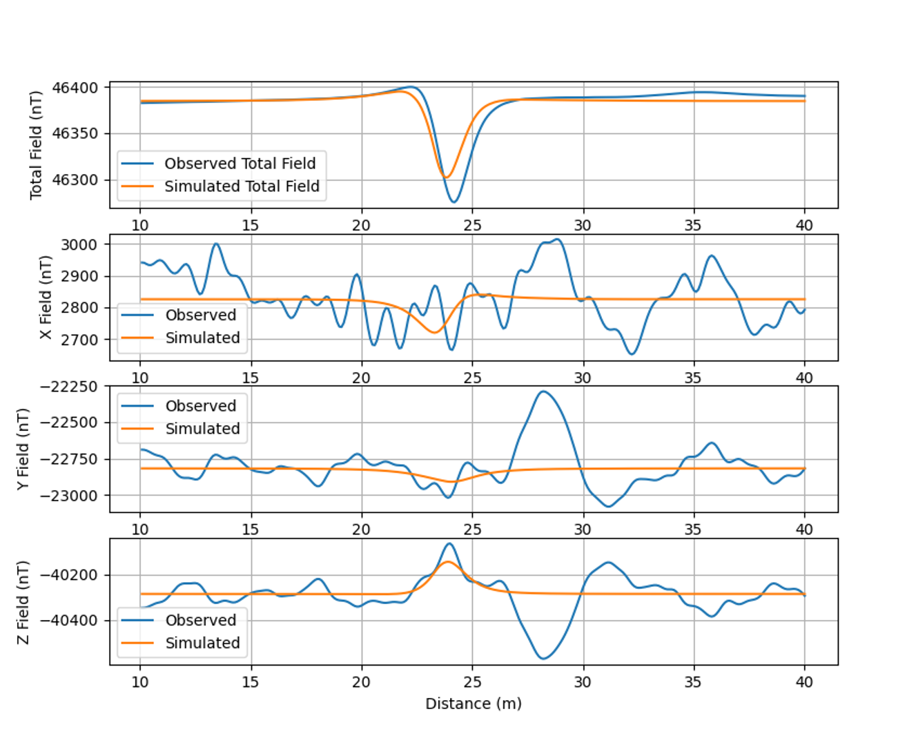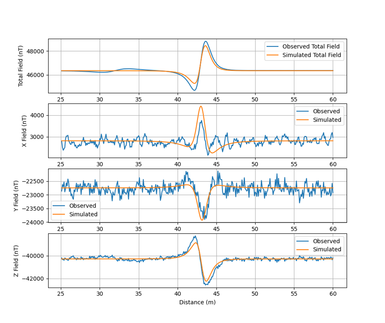 McKenna and his team were able to identify the expected ranges of the parameters of the ferromagnetic structures or devices they would be looking to measure with the scans. They were able to parameterize the targets by length, wall thickness, and magnetic susceptibility and then introduce the effects of Earth's magnetic fields (the party most responsible for inducing the signature in the metallic objects UUVs scan). The insight into the workable range of these parameters has allowed the potential field models to be easily recalibrated and solved, thus replicating various UUV runs that would normally take the team days on the water and come at a great expense computationally.